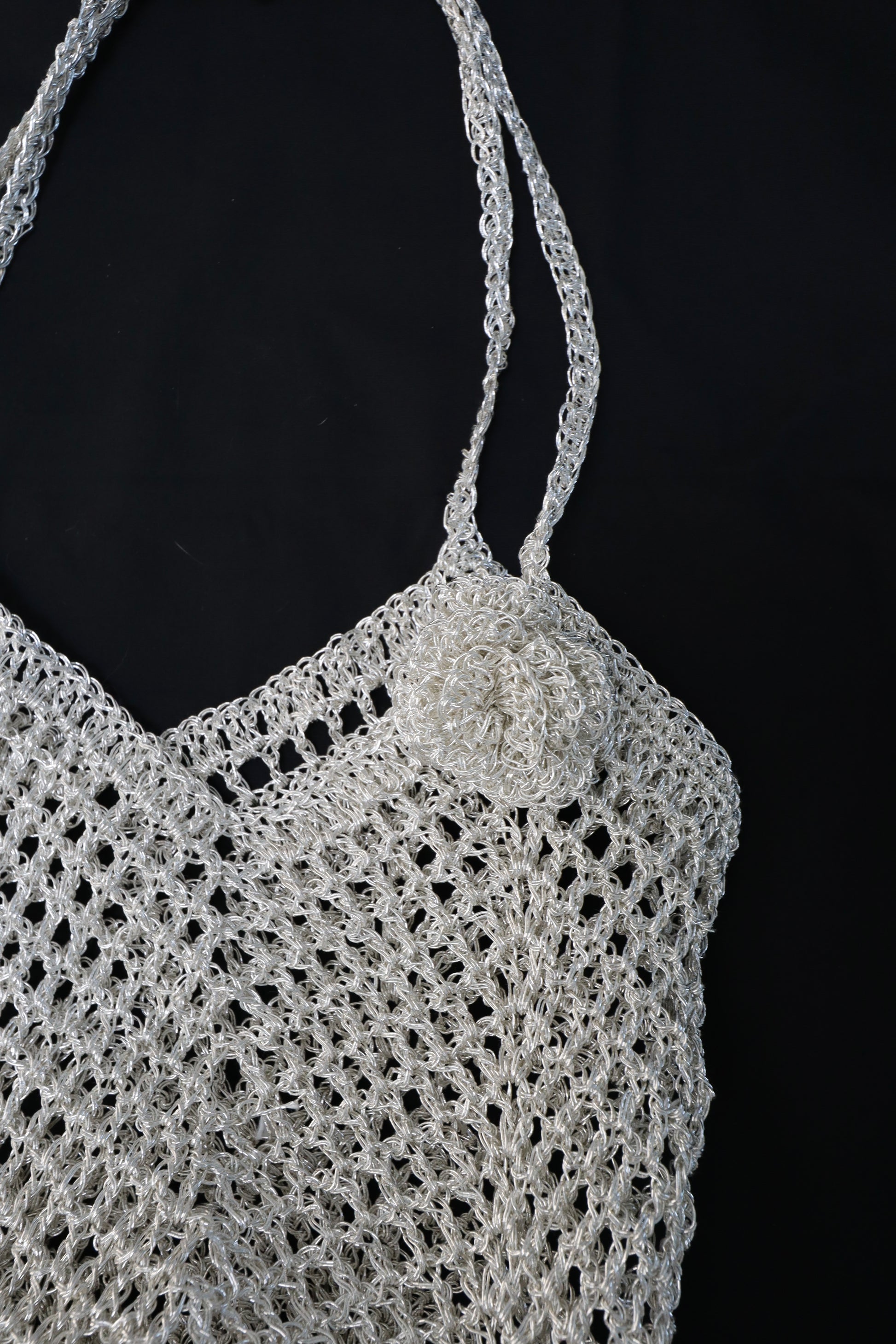 This is a specialty yarn made by tightly winding high-quality metallic film into a smooth, cord-like texture. Coated with real silver, it offers a uniquely rich silver tone that sets it apart from ordinary silver-colored yarns. It sparkles even more beautifully in person.